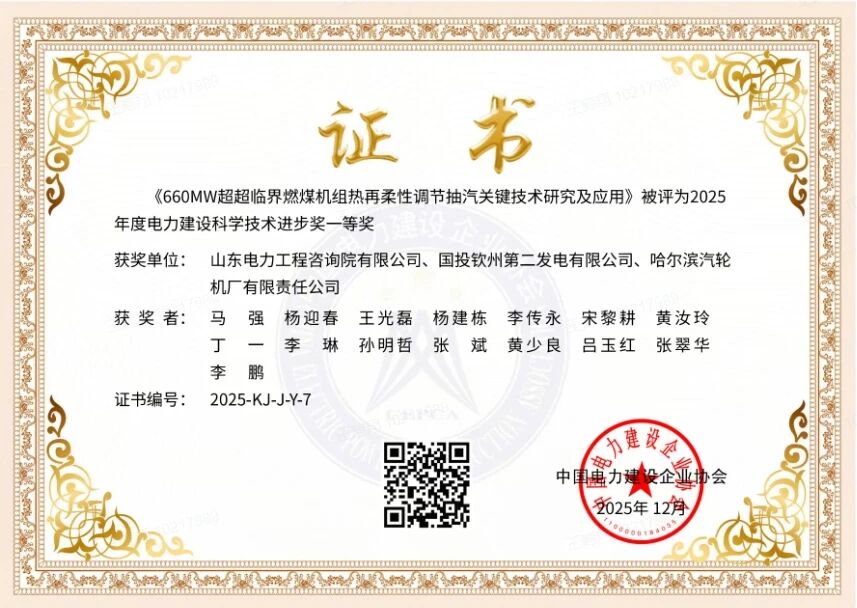 国投钦州第二发电有限公司荣获2025年度中国电力建设企业协会电力建设科技进步奖一等奖
