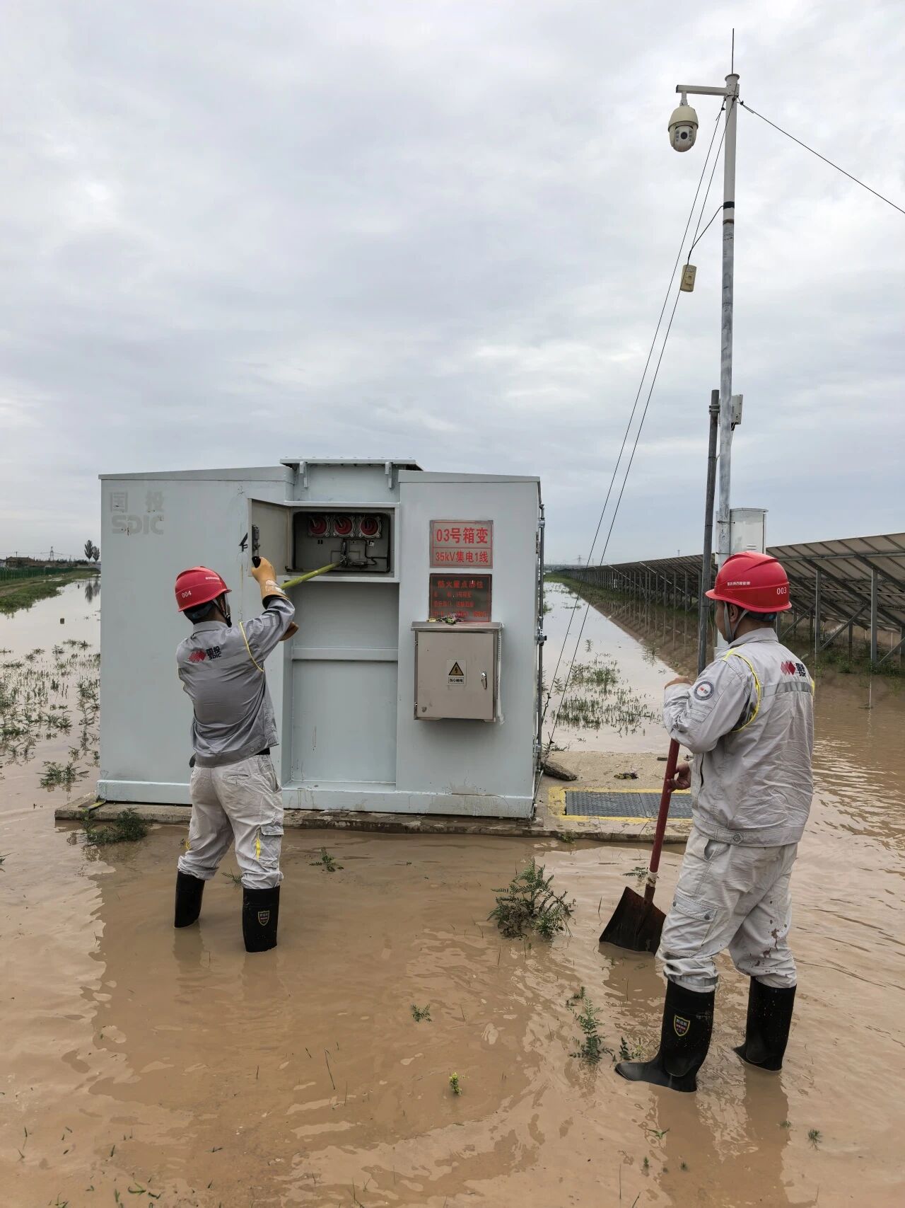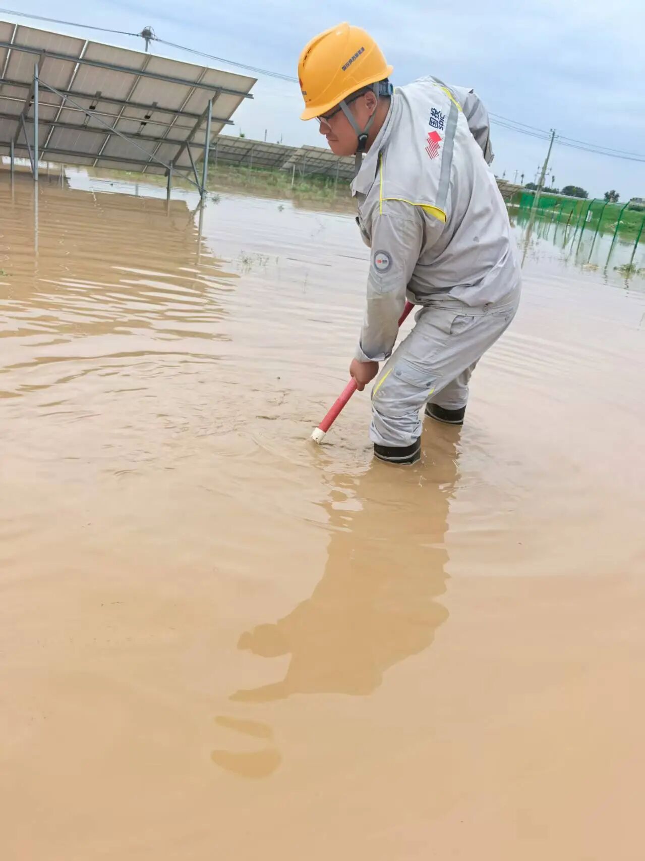为守护数千块光伏组件及箱变、逆变器的安全运行,党员先锋队对涉水严重的区域进行停电隔离,同时开展光伏区积水引流工作,引导挖掘机对积水严重的区域进行水流疏导,以“关键时刻冲得上去、危难关头豁得出来”的担当精神,成为守护场区安全的“红色脊梁”。他们用实际行动诠释了“一个党员就是一面旗帜”,让党旗在防汛一线高高飘扬。